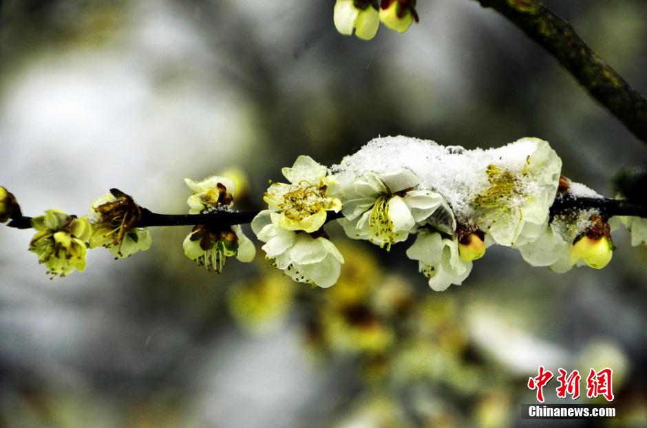 2月9日,春雪过后的湖南张家界武陵源风景名胜区银装素裹。冬春之交,寒气还未褪去,张家界国家森林公园黄石寨梅园千株早梅陆续绽放。一朵朵粉红色、黄色、白色的梅花跃然枝头,被白雪点缀,娇艳欲滴,吸引不少中外游客踏雪寻梅。吴勇兵 摄