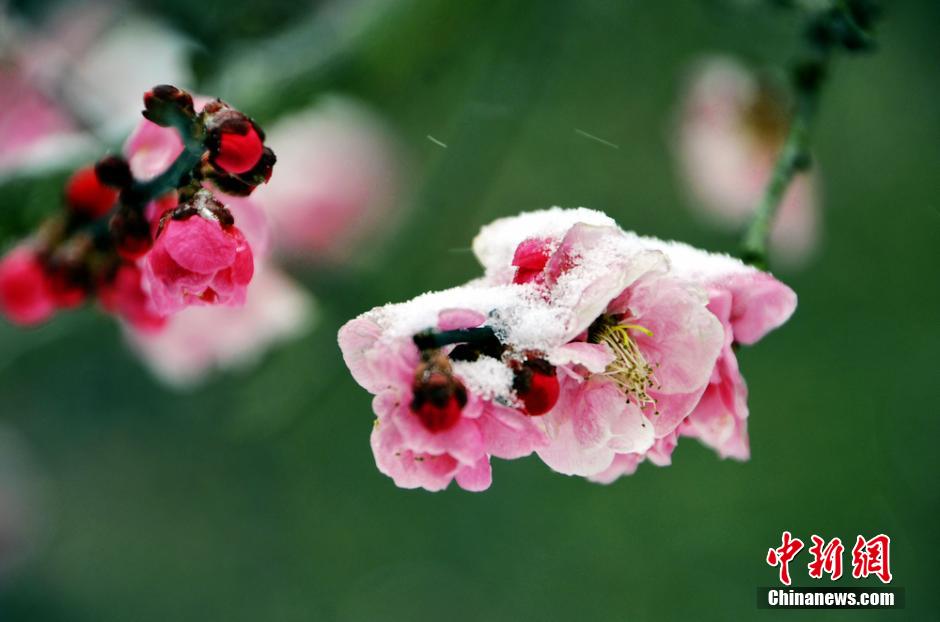 2月9日,春雪过后的湖南张家界武陵源风景名胜区银装素裹。冬春之交,寒气还未褪去,张家界国家森林公园黄石寨梅园千株早梅陆续绽放。一朵朵粉红色、黄色、白色的梅花跃然枝头,被白雪点缀,娇艳欲滴,吸引不少中外游客踏雪寻梅。吴勇兵 摄