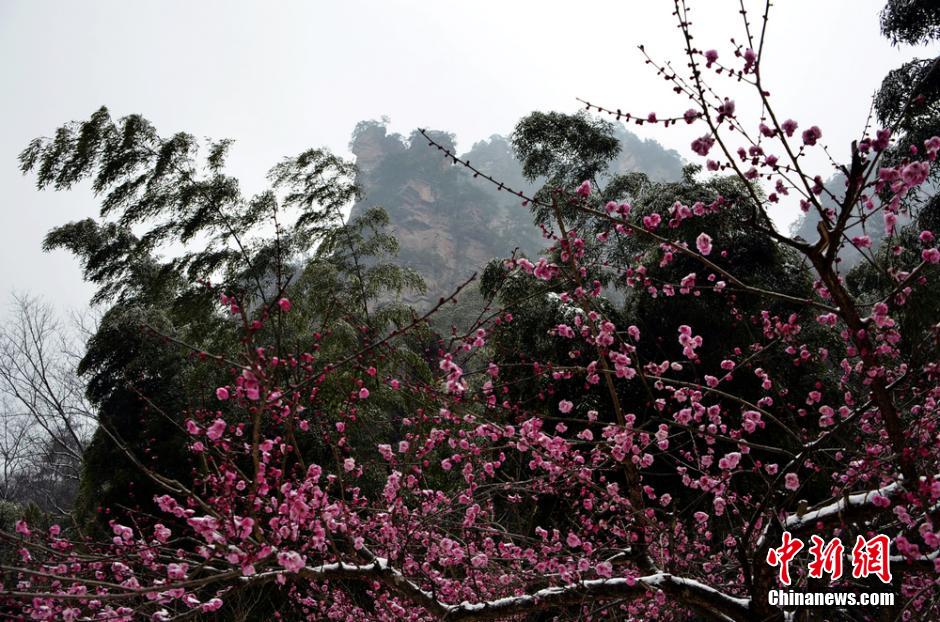 2月9日,春雪过后的湖南张家界武陵源风景名胜区银装素裹。冬春之交,寒气还未褪去,张家界国家森林公园黄石寨梅园千株早梅陆续绽放。一朵朵粉红色、黄色、白色的梅花跃然枝头,被白雪点缀,娇艳欲滴,吸引不少中外游客踏雪寻梅。吴勇兵 摄