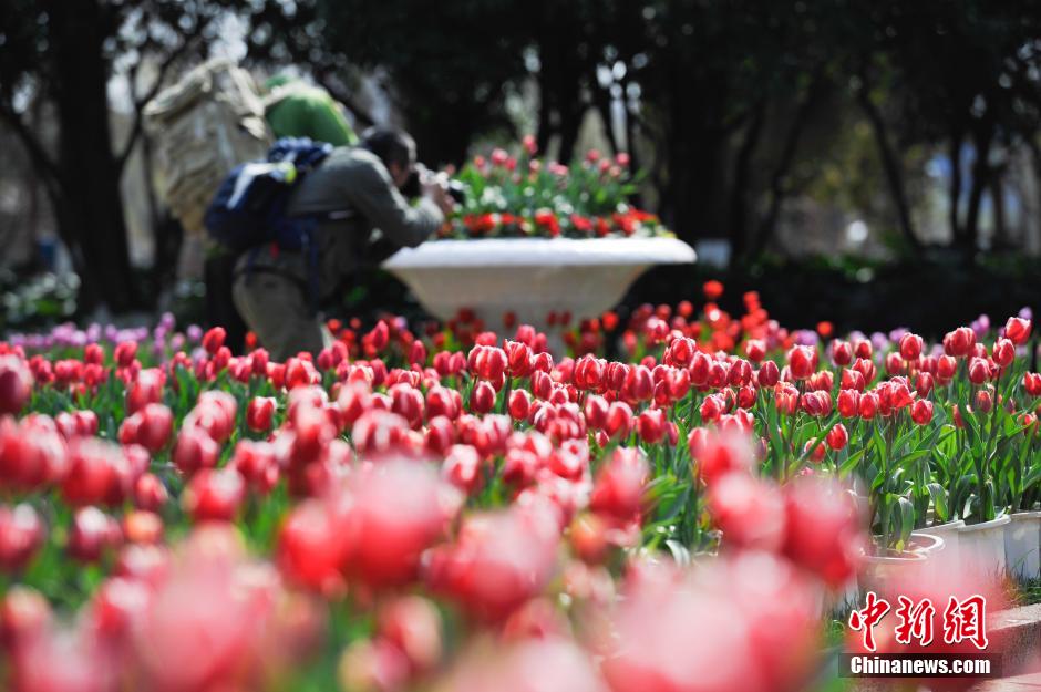 2月10日,云南昆明大观公园盛开的郁金香吸引众多游客的目光。中新社发 刘冉阳 摄