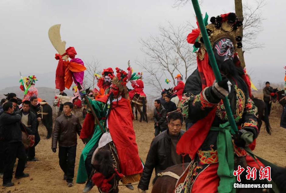 马年春节后,甘肃清水县农村的“转马”社火走村串巷祈福。只见所有玩“转马”的演员都穿着古代官袍,画着脸谱,手拿“武器”,骑着“马”,在锣鼓声中转街,称之为“马社火”。据清水县委宣传部称,“马社火”是流传于清水县的民间社火,传承已久,赋有浓郁的地方特色,这些演员大多扮演的是秦腔戏中的人物。目前,由于农村养马已少见,村民多养骡子作为劳力,所以“马社火”表演用骡子代替马。王同堂 摄