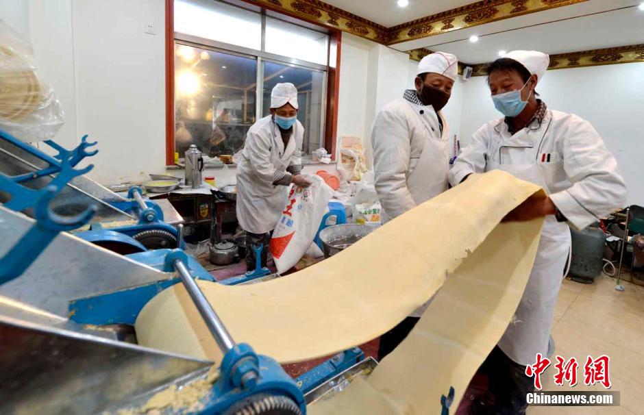 卡赛是一种油炸面食,是藏族人家款待客人的点心,也是藏历新年必备的年货之一。随着3月上旬藏历木马年的日益临近,古城拉萨卡赛生意日渐红火。图为现代化的压面机给制作卡赛带来了便利。李林 摄