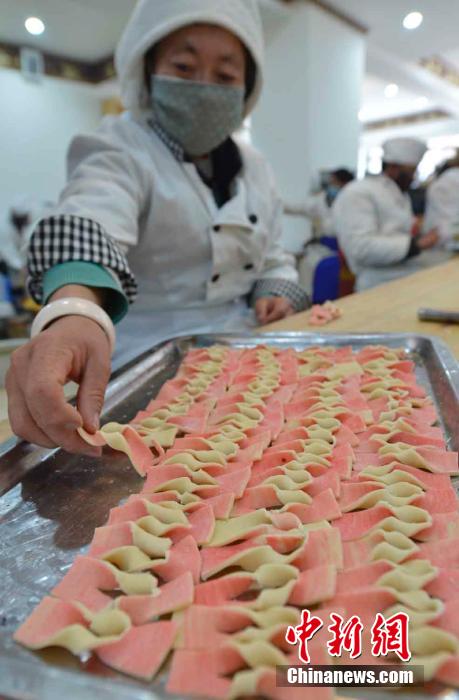 卡赛是一种油炸面食,是藏族人家款待客人的点心,也是藏历新年必备的年货之一。随着3月上旬藏历木马年的日益临近,古城拉萨卡赛生意日渐红火。图为工人正在码放即将如果油炸的卡赛。李林 摄