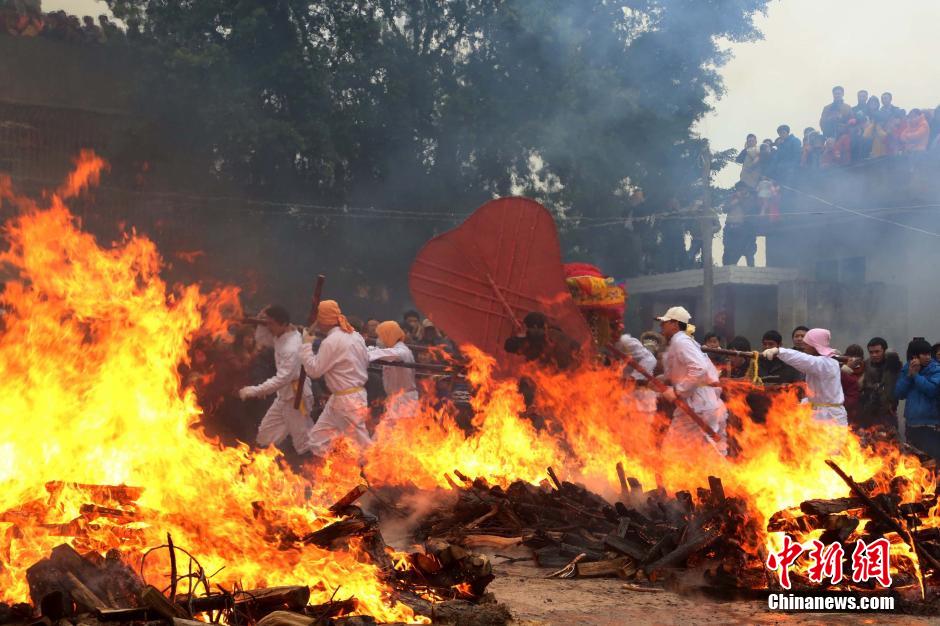 每年的正月十六,莆田许多地方鼓乐喧天、鞭炮齐鸣,男女老少涌向街头开始一种古老习俗——“跳火”。在莆田涵江区梧塘镇梧梓村,只见年轻力壮、英姿焕发的男性,身着各色统一服装,腰扎布带,每对各抬一架神轿,或在场院绕着篝火游舞,或在燃起的篝火上穿梭跳跃,周而复始,直到火熄而止。在城厢区筱塘村,“跳火”的壮汉光着脚在火堆上来回奔跑,显示阳刚魅力。在梧塘镇松东村,各路神明在鞭炮锣鼓声中上山取火种,五六十名壮汉步调一致,围着火种奔跑,显示村民的齐心合力;接着各村、各姓挑精壮青年,赤脚“赴烫蹈火”庆祝元宵,以此祈福在新的一年里家家户户兴旺发达。杨婀娜 摄