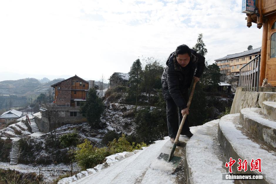 2月18日晚至2月19日凌晨,广西龙胜县境内普降小雪,雪后的龙脊梯田,银装素裹,引得不少游人前往观赏。据了解,此次降雪为鹅毛雪,气温上升后冰雪融化,交通道路、供电线路、水管等并未结冰,并未对群众生产生活未造成严重影响。预计今后两天当地以晴天为主,高山地区可能出现有冰冻和霜冻天气。图为瑶族群众在清扫门前积雪。中新社发 韦吉阳 摄