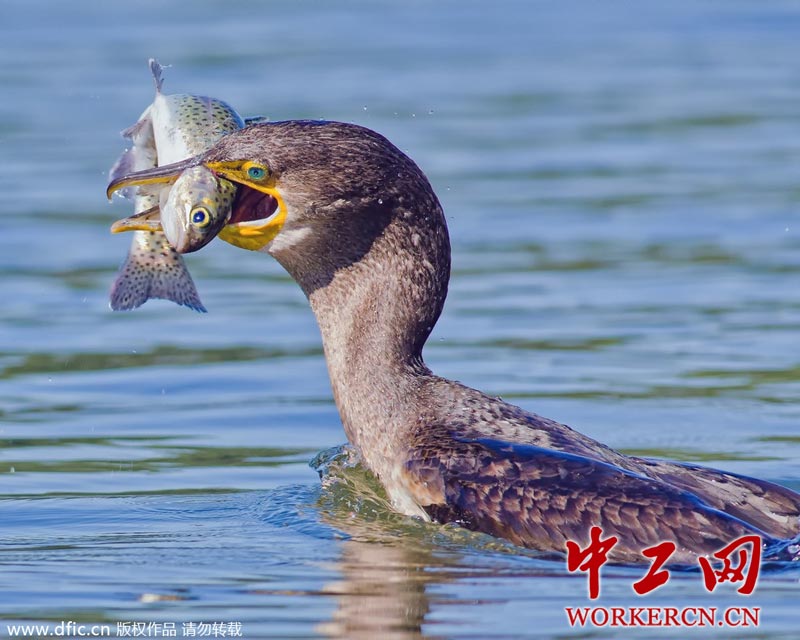 当地时间2014年2月26日报道,这套有趣的图集拍摄于美国加州长滩的岸边。图中的鸬鹚正捕到一条肥美的鳟鱼,准备大快朵颐,未料鳟鱼也不想束手就擒,努力地蹦跳挣扎,甚至一度成功地跃入空中,还用自己的身躯撞击了贪婪鸬鹚的脑袋。