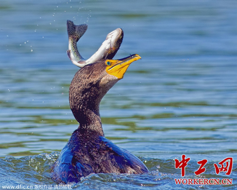 当地时间2014年2月26日报道,这套有趣的图集拍摄于美国加州长滩的岸边。图中的鸬鹚正捕到一条肥美的鳟鱼,准备大快朵颐,未料鳟鱼也不想束手就擒,努力地蹦跳挣扎,甚至一度成功地跃入空中,还用自己的身躯撞击了贪婪鸬鹚的脑袋。