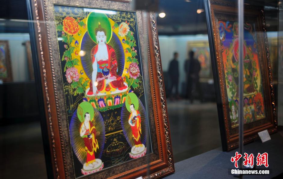 2月28日,“一花一世界——青海热贡掐丝唐卡展”在北京中华民族艺术珍品馆举办。八十件青海热贡掐丝唐卡精品向观众展示了唐卡艺术的非凡魅力。掐丝唐卡在继承藏传绘画精细柔美艺术风格的基础上,结合宫廷掐丝珐琅和坛城沙画的工艺特点,形成富丽堂皇,雍容华贵的唐卡艺术风格。中新社发 杨阳 摄
