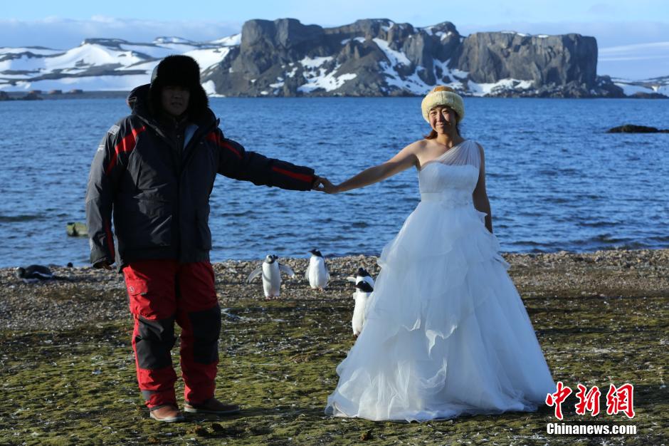 北京青年张昕宇与梁红驾驶帆船,历时231天,航行三万五千公里于2014年2月20日到达南极长城站,并在2月25日举行了计划的浪漫婚礼,实现南极之吻。中新社发 昕宇 摄