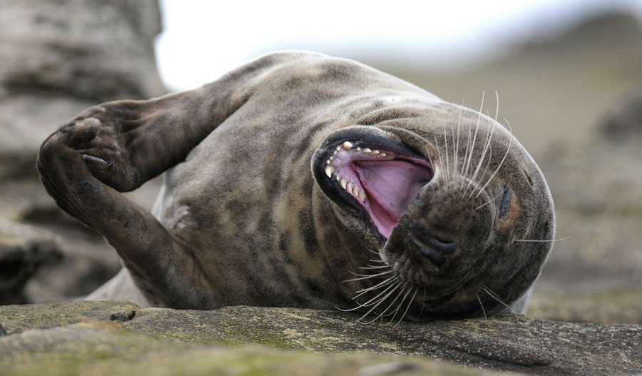照片中,一只灰海豹把嘴巴张的大大的,看起来似乎是在开心地哈哈大笑,好像是被周围某个幽默滑稽的场景逗得合不拢嘴。不过也有可能是它刚刚睡醒,懒懒地打个哈欠。 据大卫描述,拍照过程中,这只灰海豹刚刚睡醒,它悠闲地坐在海岸边靠近灯塔的大岩石上。大卫补充道,“虽然灰海豹似乎露出了哈哈大笑的表情,但是很有可能是在打哈欠。一般情况下,海豹是不会向人类展示自己的喜怒哀乐的。”