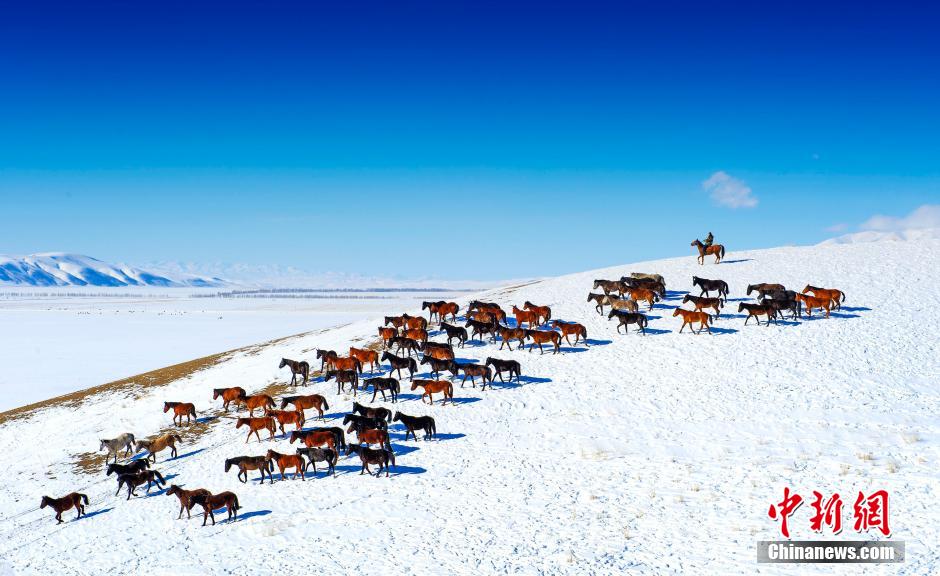 伊犁马在新疆伊犁昭苏县境内的天山脚下的草原驰骋,万马奔腾,蔚为壮观。中新社发 秦杰 摄