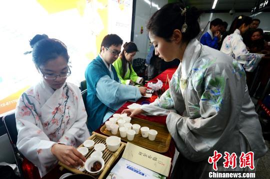 3月2日,农历二月初二,一群来自姑苏汉服社的汉文化爱好者在苏州轨道交通1号线木渎站举办了一场汉文化展示活动,庆祝“花朝节”,弘扬传统文化。当日活动现场,除了古琴、琵琶、茶道等表演之外,还教大家剪五色彩纸,粘在花枝上便可祈福,俗称“赏红”,吸引了众多市民驻足观看。据悉,花朝节,俗称“花神节”、“百花生日”、“花神生日”,是汉族的传统节日。图为茶道表演。 王思哲 摄