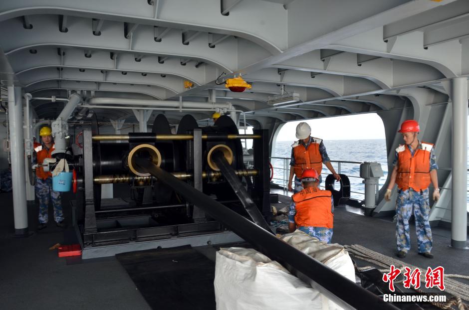 当地时间3月3日上午,第十六批护航编队太湖舰位于亚丁湾西部海域,为赴地中海接替执行叙化武海运护航任务的海军黄山舰,实施了航行中油水补给。这是黄山舰航渡至任务海区前的最后一次航行补给。图为太湖舰官兵展开补给程序。中新社发 李秀林 摄