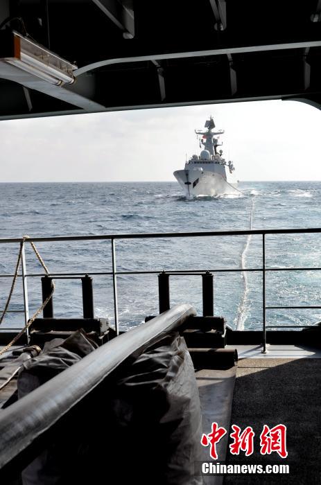 当地时间3月3日上午,第十六批护航编队太湖舰位于亚丁湾西部海域,为赴地中海接替执行叙化武海运护航任务的海军黄山舰,实施了航行中油水补给。这是黄山舰航渡至任务海区前的最后一次航行补给。图为燃油管道架设完毕。中新社发 李秀林 摄