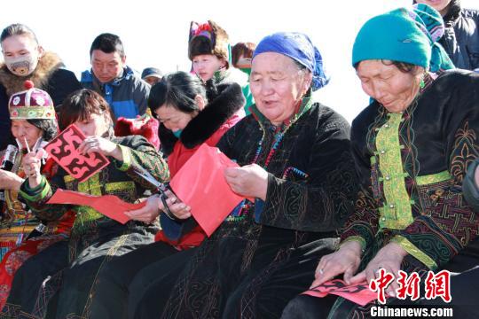 3月4日,在新疆北部和布克赛尔县莫特格乡,一场别开生面的农牧民妇女趣味比赛吸引了大家的眼球,妇女们进行了编绳子、剪纸等趣味游戏,让现场一阵欢呼和喝彩。图为农牧民妇女剪花比赛。叶尔青 摄