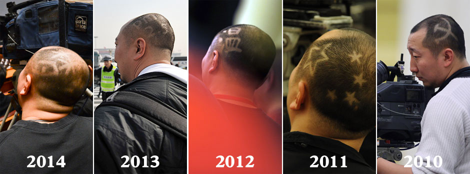 在近五年参加的两会报道中,这名记者的发型颇受关注,由2010年的“镰刀锤子”造型,到2011年的“五角星”造型,接着是2012年的“温”字头,再到2013年变成了“PM2.5”。