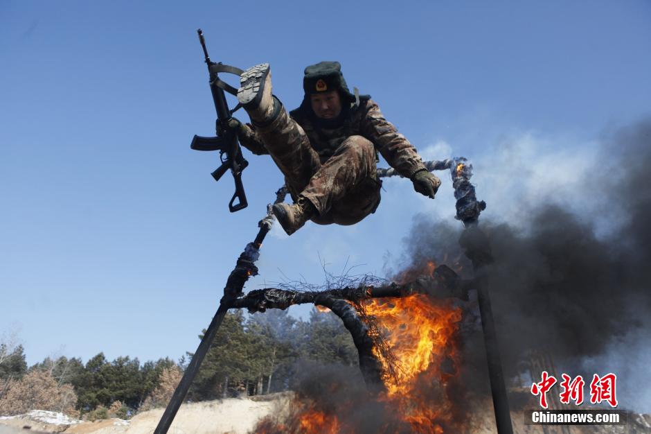 3月5日,黑龙江省军区边防某团官兵正在进行跨越火圈的实战训练。该部结合未来边境作战特点,设置模拟化战场环境,营造硝烟滚滚、枪林弹雨、炮声隆隆的实战氛围,从难从严从实战角度出发,深化“仗怎么打、兵怎么练”的实战练兵力度,着力提升部队实战条件下的作战能力,锤炼官兵敢打硬拼的过硬战斗作风。中新社发 魏建顺 摄