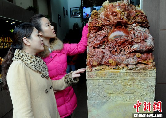 3月12日,两位女青年被福州古街首展的巨型寿山石印章所吸引。据介绍,该巨型寿山石印章重达一吨多,由福州寿山石雕刻艺术家孙兆勇采用寿山老岭石,经过一年多时间的构思创作而成,该印章印纽部分刻有《龙腾盛世》的图案。中新社发 刘可耕 摄