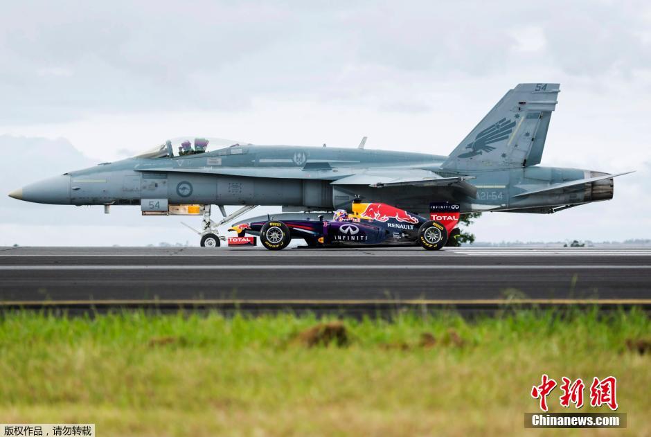 当地时间3月12日,澳大利亚墨尔本,澳大利亚F1车手丹尼尔·里卡多开着方程式赛车与空军一架F/A-18大黄蜂战机在机场跑道进行速度大比拼。据悉,此次比赛是为即将到来的F1澳大利亚站比赛进行的宣传活动。