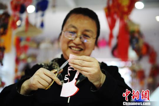 3月12日,在甘肃平凉崆峒古镇一间文化艺术品店铺内,民间艺人何霞在5分钟内为一位游客现场剪出的人物肖像剪纸画惟妙惟肖。 杨艳敏 摄