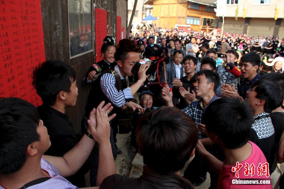 图为3月19日,节日中苗家人敬献“斗牛酒”。中新社发 李雪 摄