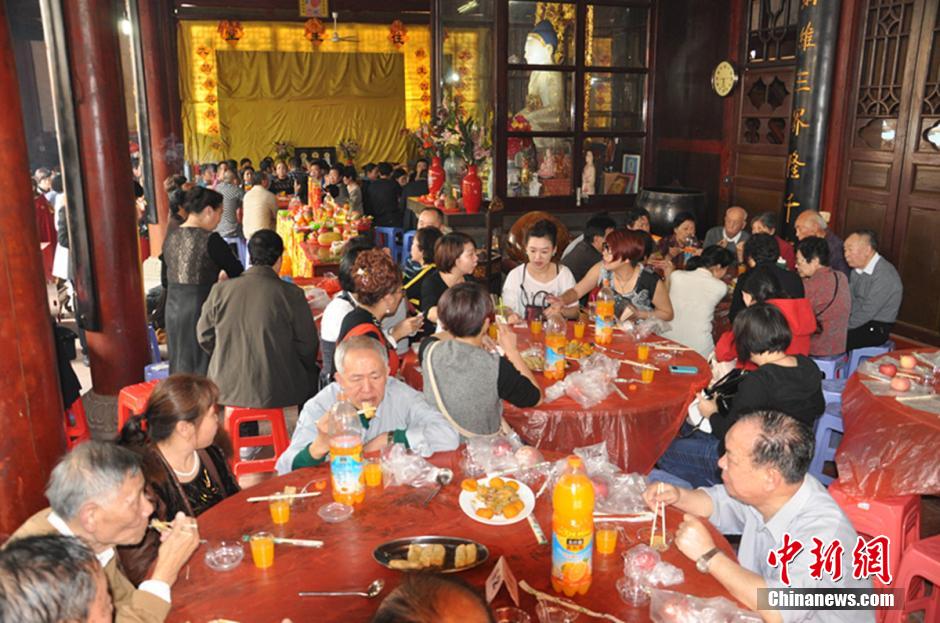 3月19日,农历二月十九观音诞,福州千年古刹开元寺举办千人素宴,场面壮观。近两千人参加宴席,一千五百多人品尝了寺中的平安吉祥面。李栋财 摄