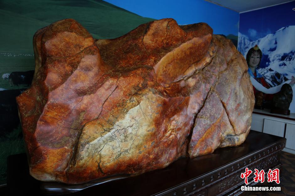 3月25日,青海省才尼藏玉藏石奇石馆收藏的重约8.5吨,长3.18米,宽1.6米,高0.9米的“藏瓷王”。据店主才尼介绍,这块藏瓷当前市场估价约在1亿元人民币,由于藏瓷稀缺,并不打算交易“藏瓷王”。据悉,目前藏瓷资源稀缺,近10年每年的市场成交价格几乎可翻两番。藏瓷又名藏瓷红,藏代表它产自西藏,瓷是由于其质感温润,质地坚硬细致宛如瓷,故名藏瓷。它产于西藏东部与青海省接壤的“三山三江”峡谷地带,在雪域高原独有的天光地气水力等自然因素下,经上千万年的合力作用自然而成。中新社发 郭雪媛 摄