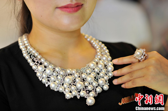 3月27日,第五届海天盛筵——中国(海南)游艇、公务机及尊贵生活方式展在海南三亚开幕。在香港曼郦珠宝展位所展出的一款名为瀑布的珍珠钻石项链格外耀眼,设计灵感来源于瀑布,用南洋的珍珠和南非的钻石镶嵌组合而成,其售价为288万元人民币。中新社发 骆云飞 摄