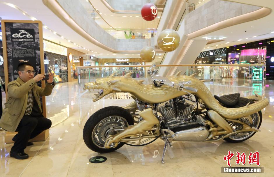 3月27日,市民被展出的“龙版”特别款OCC摩托车吸引。当日,两款来自美国的世界顶级手工定制摩托车亮相南京德基广场。中新社发 泱波 摄
