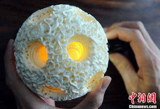 3月28日,正在福州一艺术馆展出的直径仅11cm的牙雕作品《象牙球》令人惊叹。据介绍,该牙雕作品经中国工艺美术大师经过一年多的创作而成,用整块象牙雕刻成35层镂空,球内套球逐层镂空,而每层镂空厚度只有1毫米左右。中新社发 刘可耕 摄