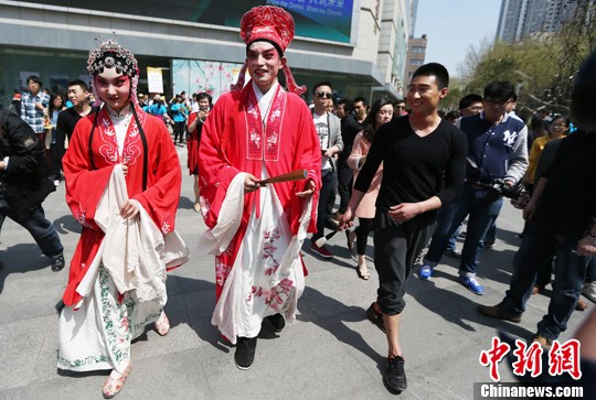 3月30日,打扮成“唐伯虎”与“秋香”的演员现身南京街头与市民互动,为5月9日-11日在南京文化艺术中心上演的中国第一部肢体幽默互动舞台剧《唐伯虎点秋香》宣传造势。中新社发 泱波 摄