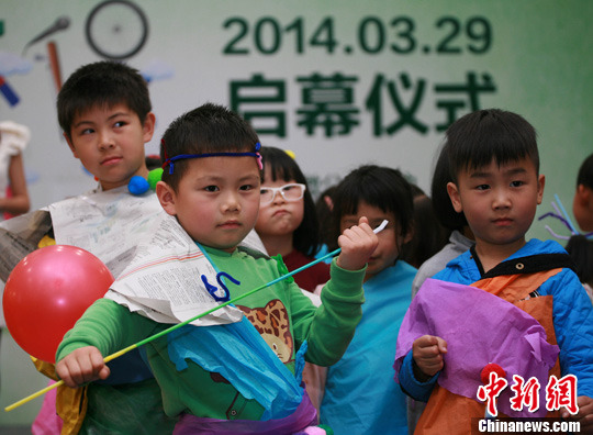 3月29日,杭州古墩印象城携手妙趣汇举行“环保·印象四色花”微公益行动,活动现场,百名小朋友巧用报纸等废品做成服饰进行T台展示,倡导环保理念。中新社发 李晨韵 摄
