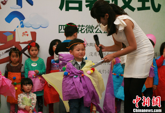 图为小朋友巧用报纸等废品做成服饰进行T台展示。中新社发 李晨韵 摄