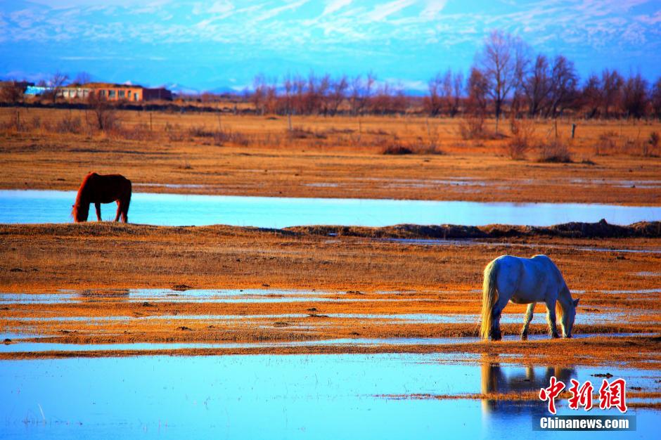 春季的新疆哈巴河县湿地一片生机,骏马在湿地内趟水觅食,与远处的高山、近处的水与草构成了一幅美丽的画卷。中新社发 刘是何 摄