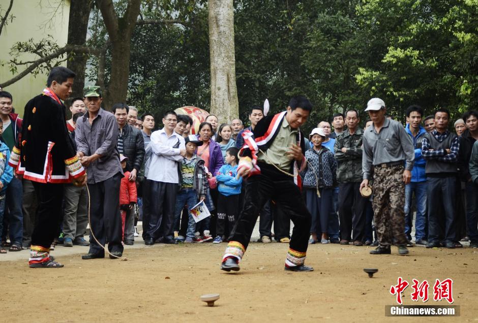 图为少数民族男子展开打陀螺竞技。翟李强 摄