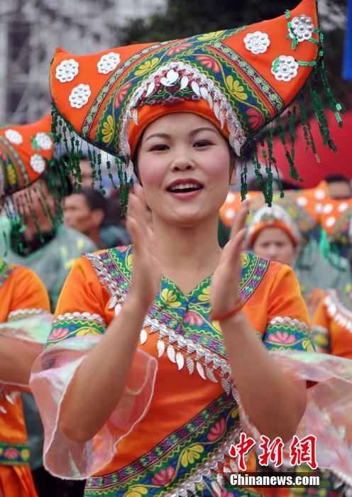 广西壮族民众欢庆“三月三” 千人冒雨跳竹竿舞