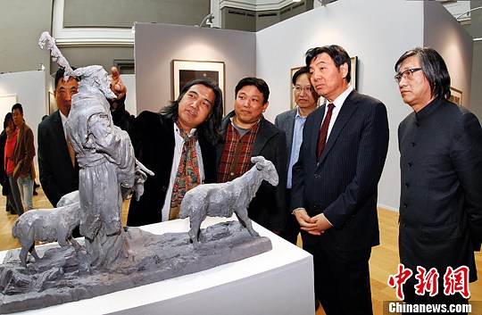 中国美术家协会副主席、中国雕塑院院长、中国当代著名雕塑家吴为山向翟隽、殷福、柯志华、马书林等介绍精美展品。 宝胜 摄