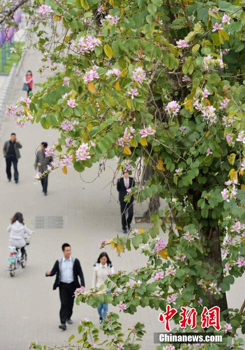 4月3日,福州街道两旁羊蹄甲花朵盛开。连日来,福州市工业路、温泉路等和许多公园内的羊蹄甲树进入花期,花香迎面扑来,盛开的花朵把福州城装扮的别样美。张斌 摄