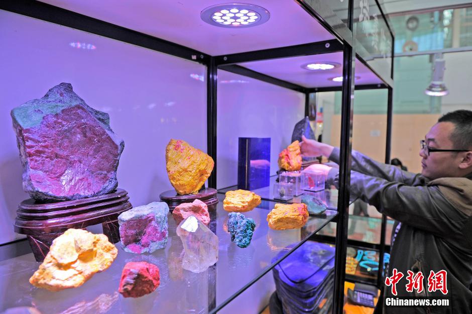 4月3日,商家在摆放沙佛莱、雄黄等各种五彩斑斓的奇石。当日,为期五天的第八届天津国际珠宝首饰展览会在天津梅江会展中心开幕。中新社发 佟郁 摄