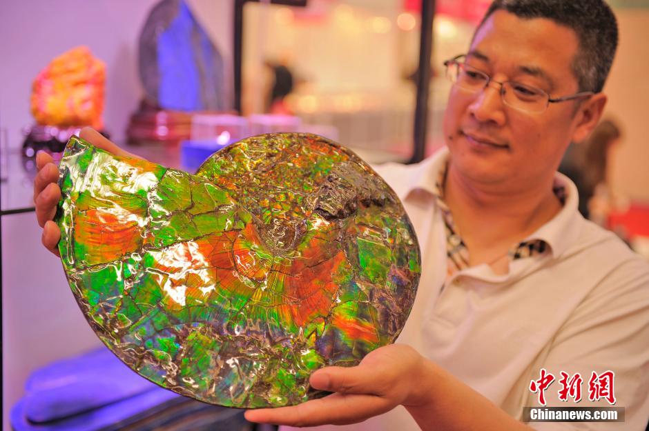 4月3日,一名美国展商展示一块收藏级美国绿松石。当日,为期五天的第八届天津国际珠宝首饰展览会在天津梅江会展中心开幕。中新社发 佟郁 摄