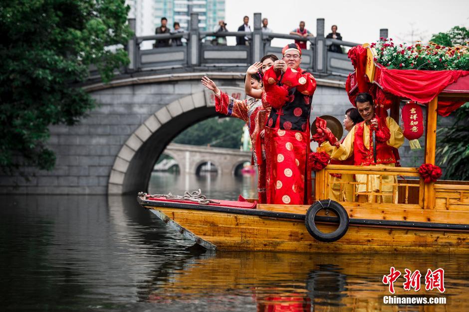 广州举行集体婚礼 新人坐花船重现传统水上婚俗