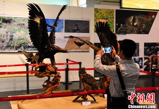 4月3日,“地球第三极的生灵——珠穆朗玛峰国家级自然保护区野生动物展”在广东省博物馆开展,该展展出200多件野生动物标本和300多张实地科考照片,为观众展示40多位广东科考队员镜头下的珠穆朗玛峰上野生动物的生存环境。中新社发 陈骥旻 摄