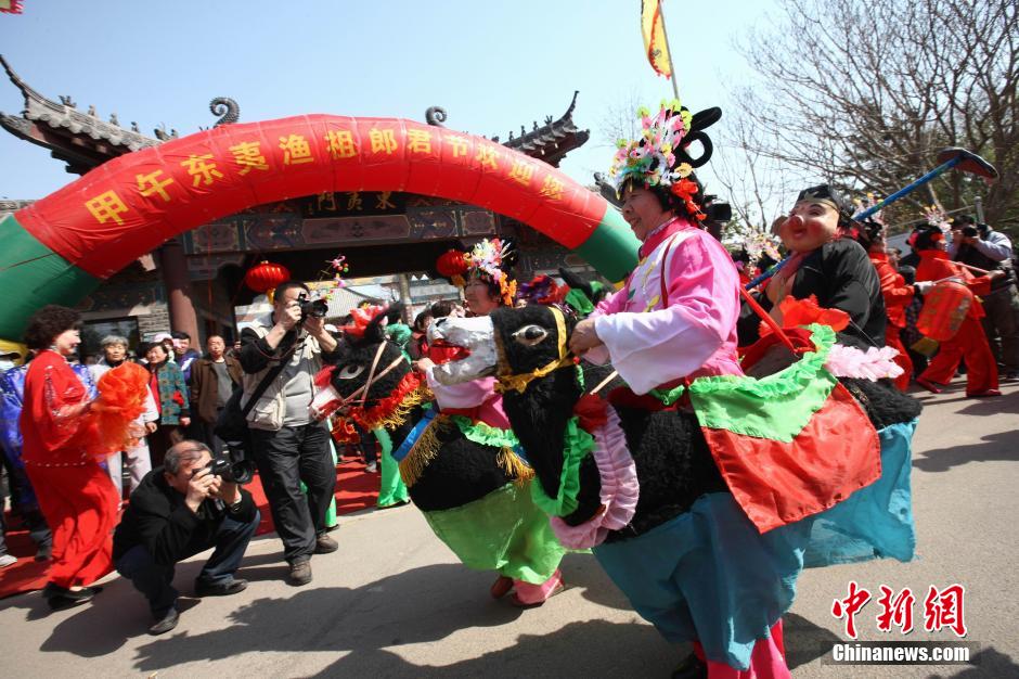 4月4日,青岛市城阳区红岛街道韩家,第三届东夷渔祖郎君节拉开序幕。渔民们走上街头,表演了迎亲、秧藏、赶驴、舞狮等渔家婚俗及民间艺术,向游客展示渔家的历史文化。据考证,中国渔业最早发源于炎黄时代,东夷部落首领郎君氏在胶州湾北部教人们结网造船、出海捕鱼,被后人尊为“渔祖”。中新社发 徐崇德 摄