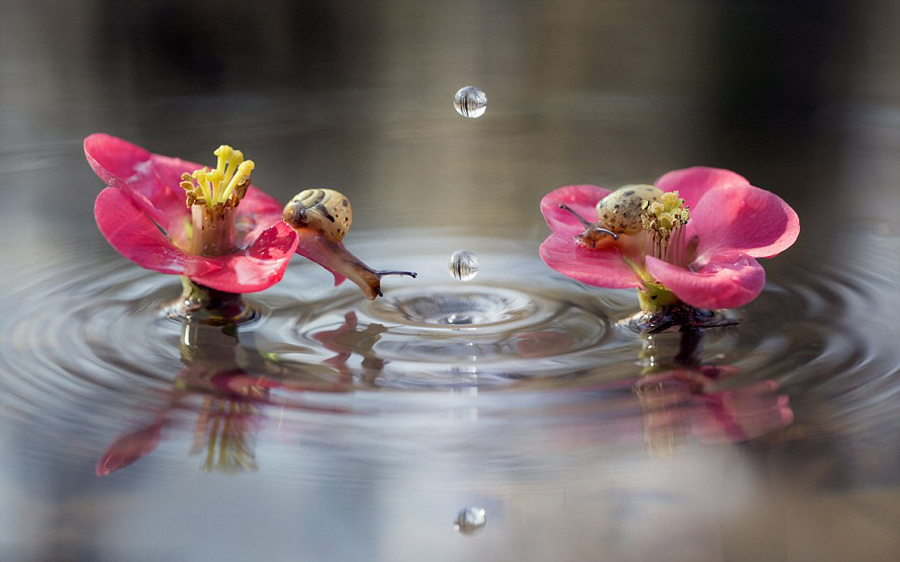 镜头里的蜗牛把脖子伸得老长,注视着水面上的“无底洞”。它们看得目不转睛,整整五分钟一动不动。39岁的职业摄影师帕尼扎说:“我当时准备拍一系列池塘的照片,想拍水面上那两朵花,突然发现花上有两只蜗牛,它们看着水滴落下来都看呆了。一开始我还以为它们看的是自己在水里的倒影呢,结果其实是在看水滴溅起来的涟漪。看着这两只蜗牛实在是很好玩,但我不知道它们是怎么想的,我猜它们是特别有好奇心的蜗牛吧。”