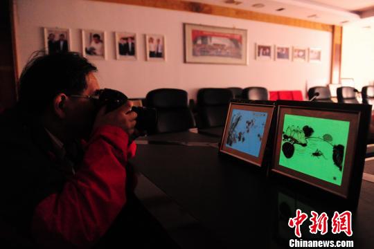 4月4日,湘籍留澳设计师曾理在湖南湘绣城展示了自己申请专利的“夜视”湘绣作品。据曾理介绍,《兰花金鱼》、《墨荷图》这两幅作品通过特殊的绣法制成,湘绣上的图案能在黑暗环境中独立发光。 图为一位记者正在昏暗的环境中拍摄发光的《兰花金鱼》、《墨荷图》。杨华峰 摄