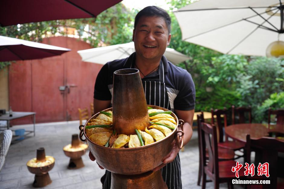 4月6日,大厨与他做好的炊锅。在云南省蒙自市,每家每户都有清明做炊锅的传统,扫完墓以后,一家人就围着热气腾腾的炊锅尽情享受美味。云南炊锅与北方涮羊肉的铜锅一样,上部为煮菜的锅,下部是烧木炭的火炉,烟囱则穿锅而上,占据了整个锅的中间部分,二者连为一体。但云南炊锅的准备过程却极为讲究,需要把事先烹调过的荤素食材一层一层铺在锅里,然后浇上熬制好的高汤,盖上锅盖焖煮半小时后,就能享用美味了。中新社发 刘冉阳 摄