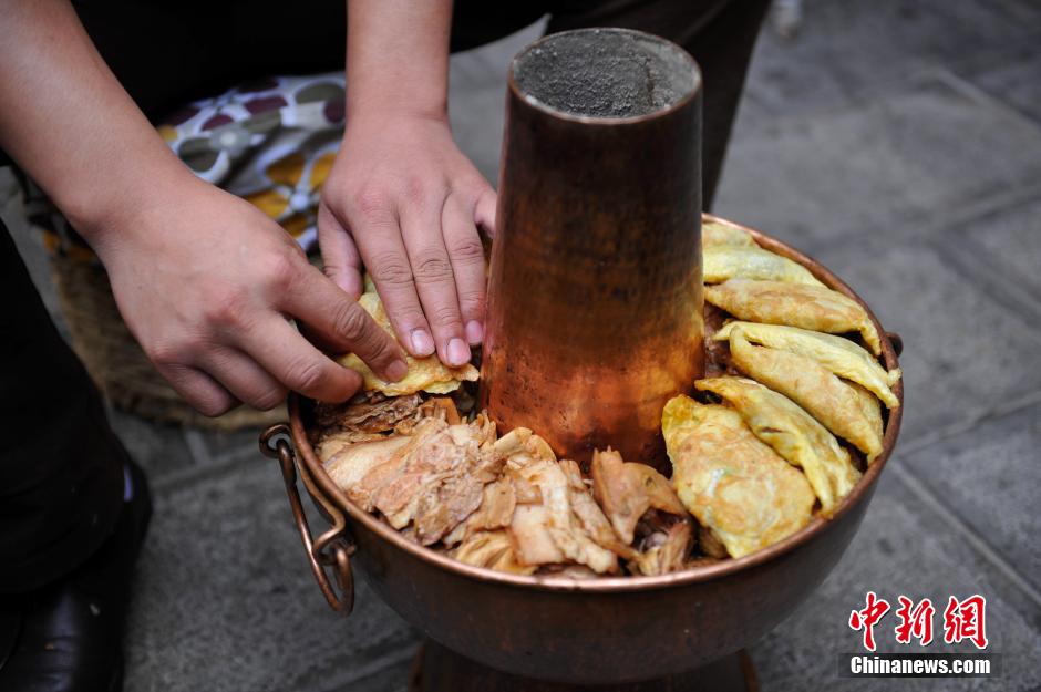 4月6日,一家餐馆的厨师用传统的做法在装炊锅,铺在第一层的是肉蛋卷。