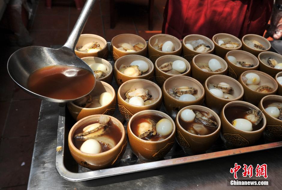 图为佛跳墙的主料经过烹饪后分别装入一个个盅里。吕明 摄