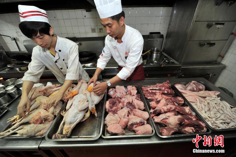 图为蔡师傅正在准备炼制高汤的食材,包括老鸭、野鸡、大骨、猪蹄尖、猪皮、鸡脚等材料。吕明 摄