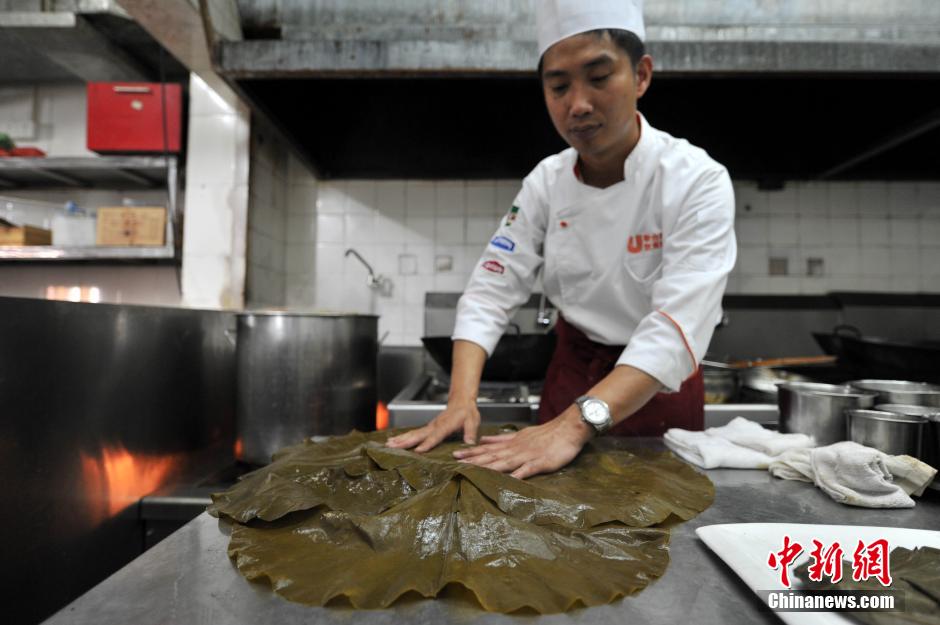 图为在锅盖上铺上荷叶,能更好的锁住味道,并带有淡淡的荷叶香味。吕明 摄